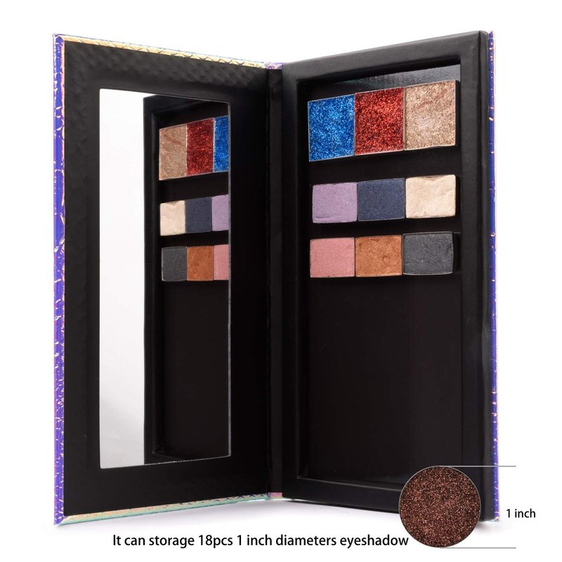 - Mermaid Magnetic Makeup Palette:Length Outside: 7.12 Inches,Width Outside: 4.01Inches, Depth Outside: .55 Inches ; Length Inside: 6.37 Inches ,Width Inside: 3.18Inches, Depth Inside: .2 Inches,which can storage 18pcs 1 inch diameters eyeshadow.