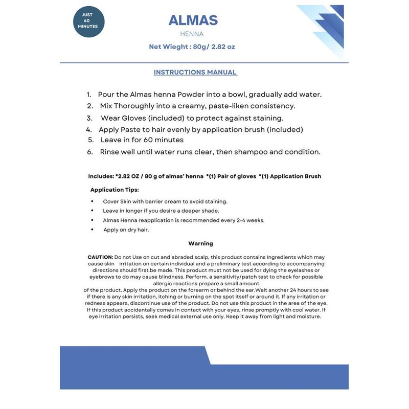 - PACKAGE CONTENT: Each box of Almas Henna comes with hair coloring kit which includes henna powder, gloves, application brush, application instruction on back side of the box.