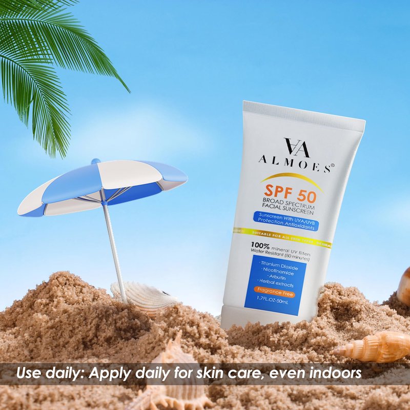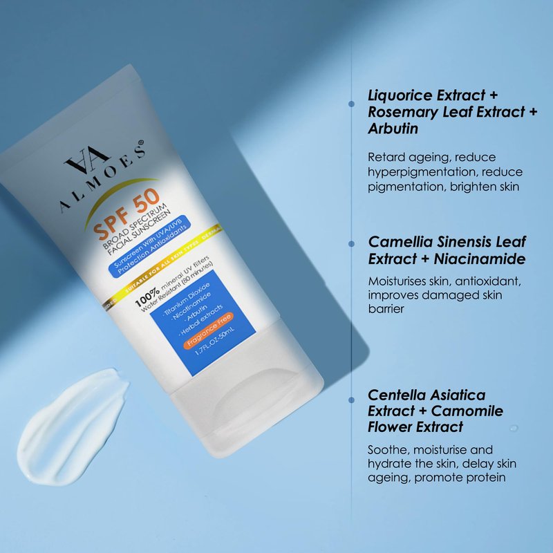 Almoes Moisturising Sunscreen, Face Sunscreen Clear Broad-Spectrum SPF 50,Facial Sunscreen with Niacinamide + Centella Asiatica Extract,Hydrate & Antioxidant,Travel Sunscreen,Suitable for all skin