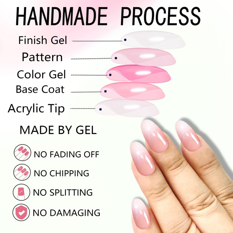 - šćGlue on Nails Almond Shapeć - Press ons easy to wear and unloading Instead of spend lots time and money at nail salon, you can press on change you nails style in 15 minutes anytime and anywhere. (The fake nails will stay longer if you clean your nails before use, and avoid water within the first hour of wearing).