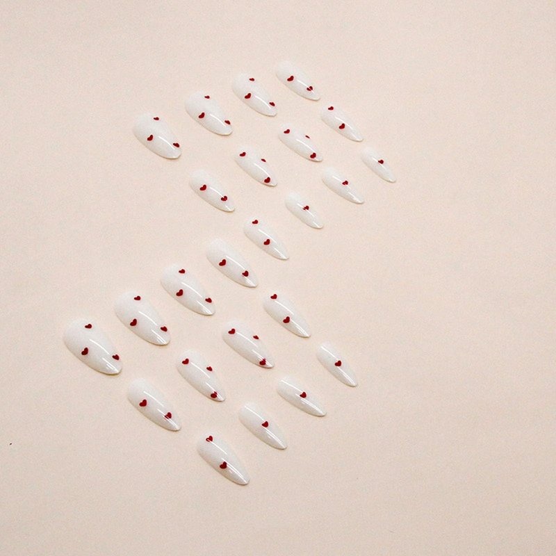 Almond Press on Nails Heart Fake Nails Medium Length Acrylic Nails Glossy Yogurt White False Nails with Wine Red Heart Designs Daily Glue on Nails for Women Girls