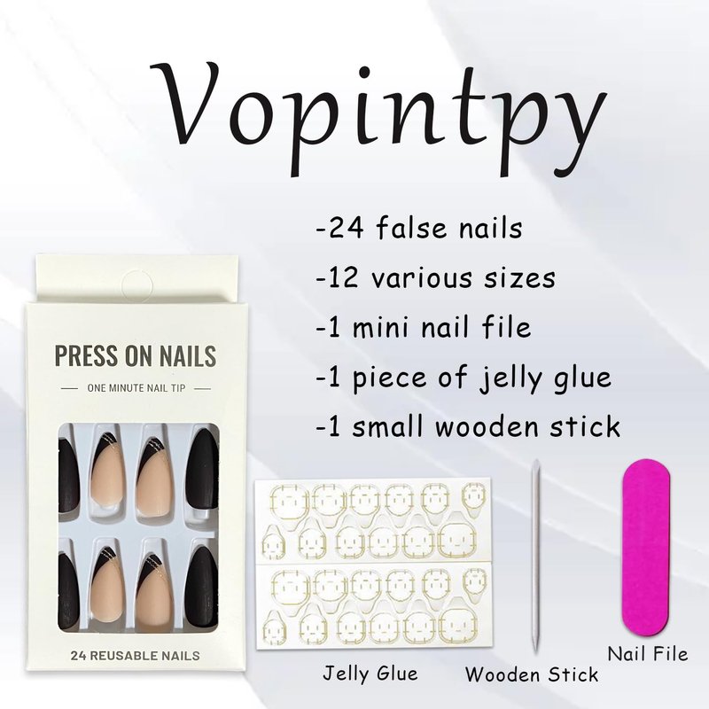 - 【Package & DIY Nails】You'll get 24 false nails in 12 sizes. 1 mini nail file, 1 small wooden stick, 1 piece of adhesive tab glue. You can safely choose a fake nail that fits your finger size and DIY your desired nail shape.