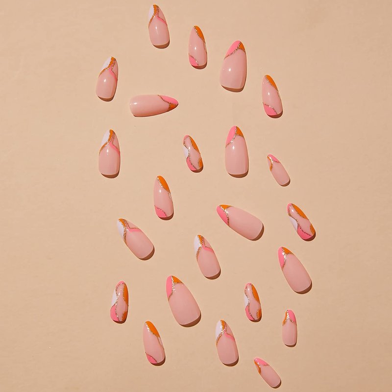 Almond Press on Nails Orange Gold Line False Nails Medium Almond Shaped Full Cover Stick on Nail Artificial Glossy Acrylic Fake Nails DIY Manicure Decoration for Women 24Pcs