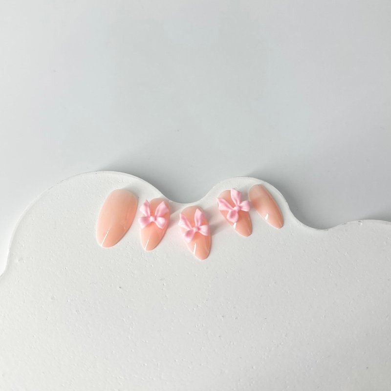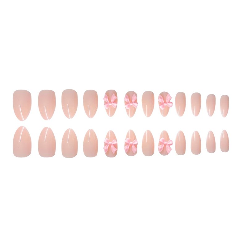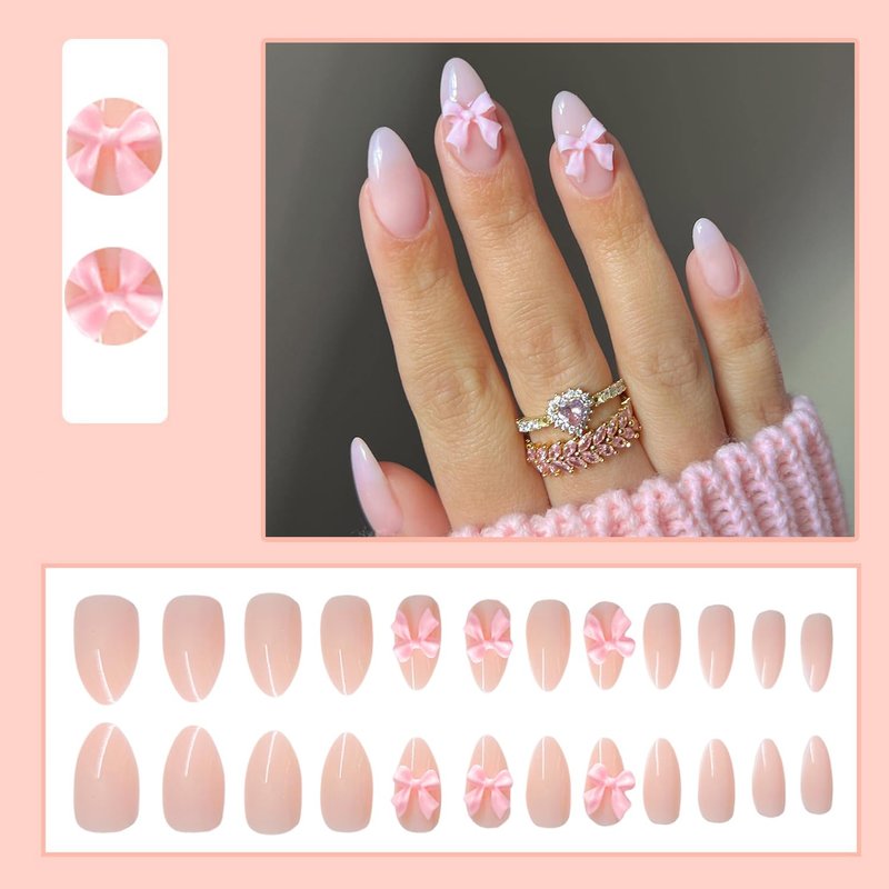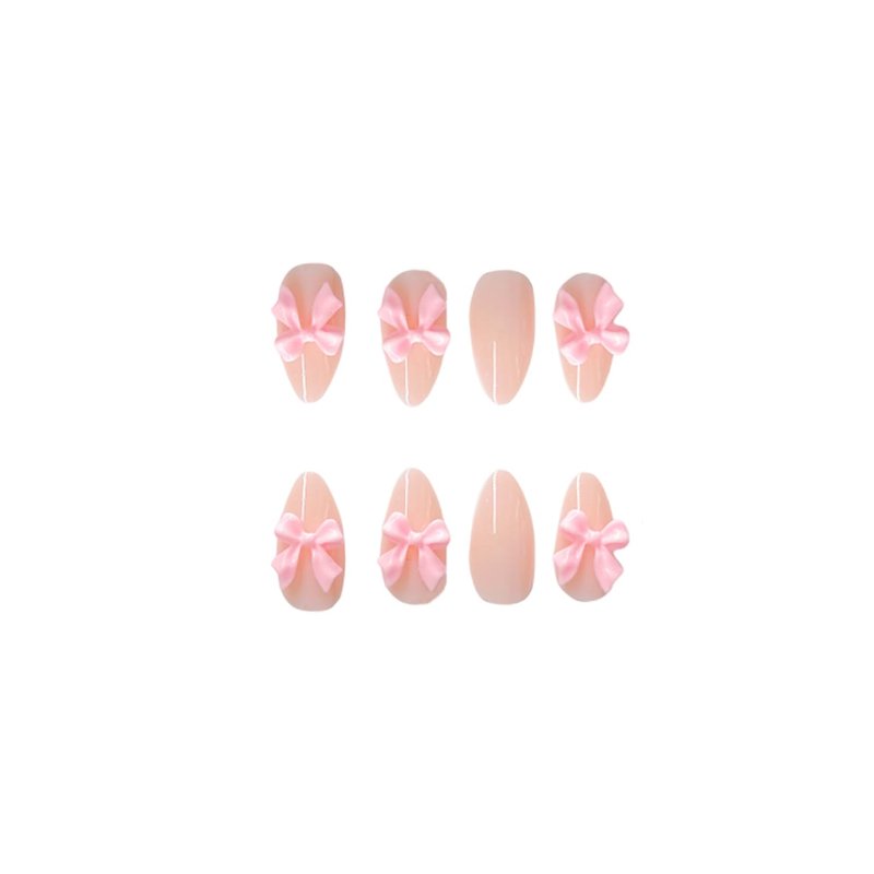 Almond Press on Nails with Bow Charm Designs Cute Pink Fake Nails Medium Almond Shaped Acrylic Nails Gloss False Nails Reusable Glue on Nails for Women Girls