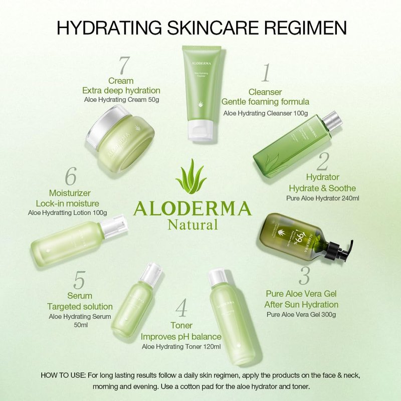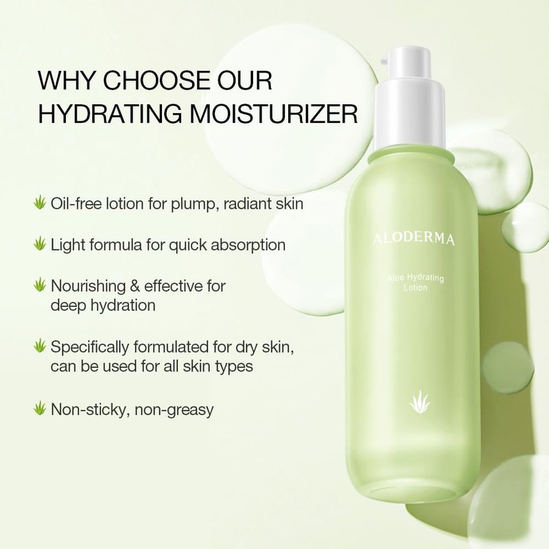 Replenish and illuminate your skin with ALODERMA's Aloe Hydrating Moisturizer, a lightweight face moisturizer packed with 77% fresh, organic aloe vera. This fast-absorbing formula hydrates with the help of hyaluronic acid and locks in moisture with Black Oat Seed Extract and Shea Butter for a soft, radiant glow. Suitable for all skin types, especially normal, dry, and combination skin, this vegan and cruelty-free moisturizer is free of harsh chemicals and artificial fragrances. Aloderma uses a proprietary process to capture the power of over 230 aloe vera nutrients, delivering a natural solution for hydrated, brighter, and smoother-looking skin.