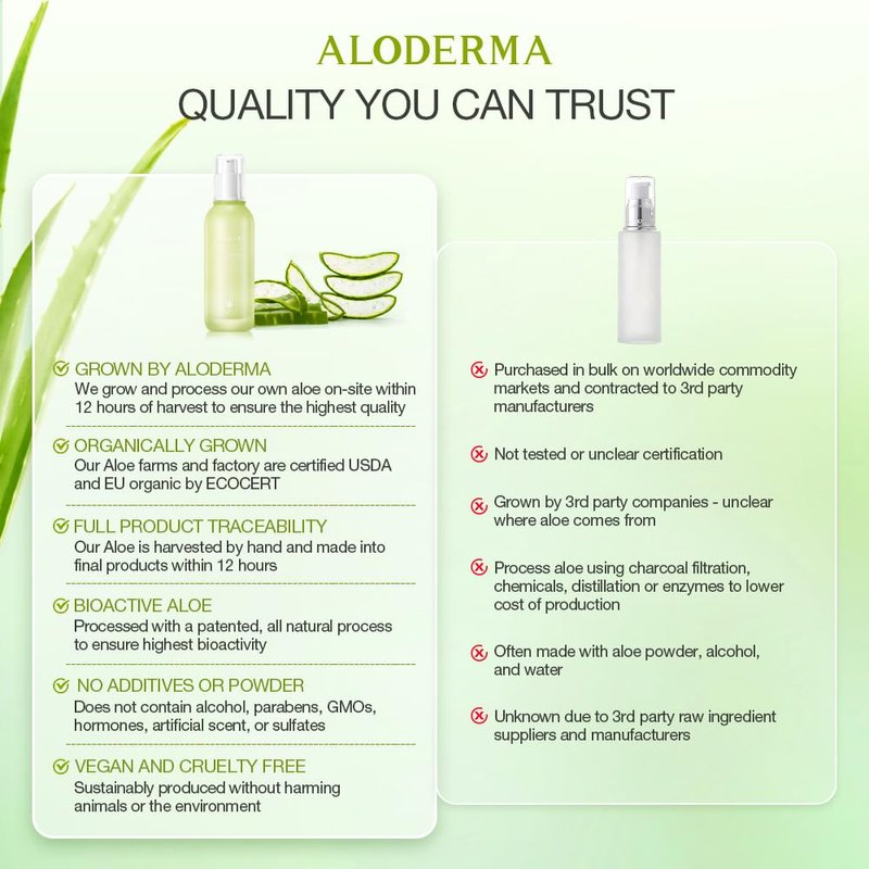 - Made within 12 hours of harvest: At Aloderma, our skincare is rooted in the earth. Our Aloe is processed on-site and turned into final products within hours of leaving the fields to ensure that we capture the natural power of Aloe Vera in every product we make.