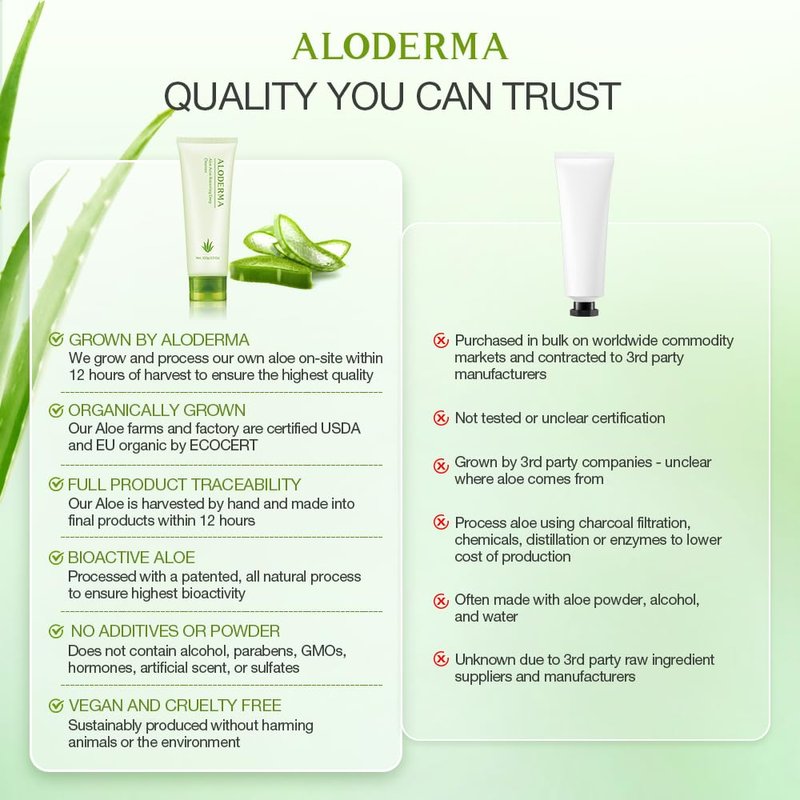 - Made Within 12 Hours of Harvest: At Aloderma, our skincare is rooted in the earth. Our Aloe is processed on-site and turned into final products within hours of leaving the fields to ensure that we capture the natural power of Aloe Vera in every product we make.
