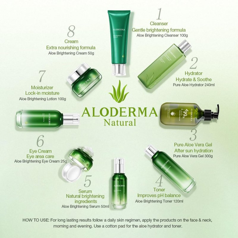 Unveiling a radiant complexion is easier than ever with Aloderma's Aloe Brightening Moisturizer, a face lotion powerhouse formulated with 75% fresh, organic aloe vera. This facial lotion is specifically designed for normal, dry, maturing, and hyperpigmented skin, effectively tackling uneven skin tone, fine lines, wrinkles, and dehydrated skin. Featuring a blend of antioxidant-rich olive leaf extract, brightening niacinamide, and hydrating squalane, this aloe face moisturizer nourishes and protects, leaving your skin smooth and radiant. We use only pure, fresh aloe vera, never any concentrates or fillers, and over 95% of our ingredients are naturally derived. Free of harsh chemicals, artificial fragrances, and cruelty-free, Aloderma infuses the power of nature's goodness into every bottle.