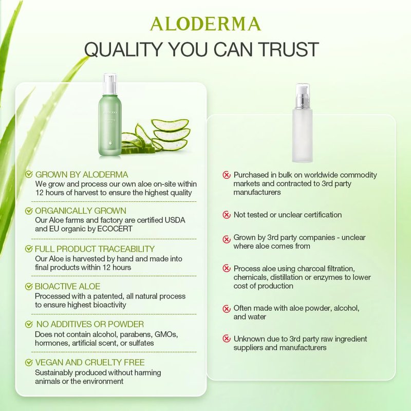 - Aloderma: We are a family run farm-to-face skin care line focused on producing and creating high-quality organic aloe vera-based products in an ecologically friendly way. We grow organic aloe vera on our own farms and manufacture all of our products in our factory, which are certified USDA and European Union organic by ECOCERT. Aloderma has over 20 years of working with Aloe providing high quality and affordable products for beauty, health and wellness.