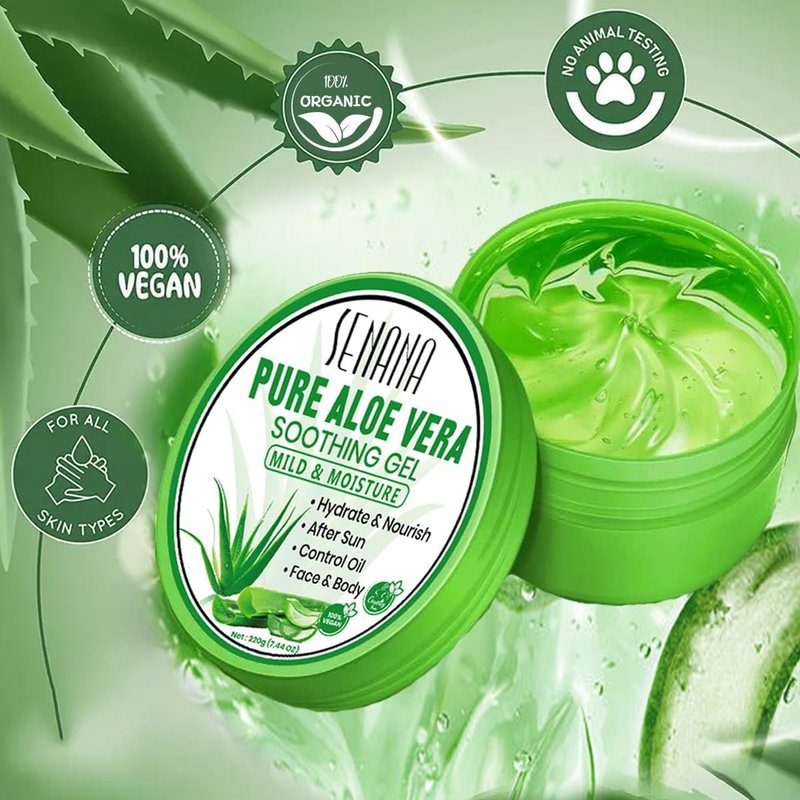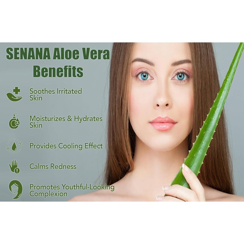 - Instant Soothing Relief: SENANA pure aloe vera gel provides soothing relief and a cooling sensation for your skin after sun exposure. Its natural, gentle formula calms irritation and hydrates dry skin. With its cooling properties, it helps alleviate redness, offering nourishment and comfort to your sun-kissed skin.