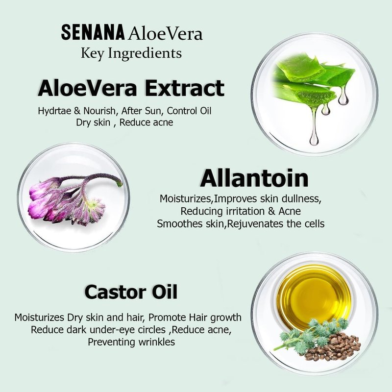 - Pure Aloe Vera Gel: SENANA Pure Aloe Gel stands as a swift-acting moisturizing solution, effectively aiding in the rejuvenation of the skin's innate equilibrium and moisture levels. It offers profound hydration, fostering a complexion that appears youthful and resilient, characterized by a plump and supple texture. With its lightweight consistency and rapid absorption, it proves suitable and beneficial for individuals of all skin types, ensuring a nourishing experience that enhances skin health and appearance.