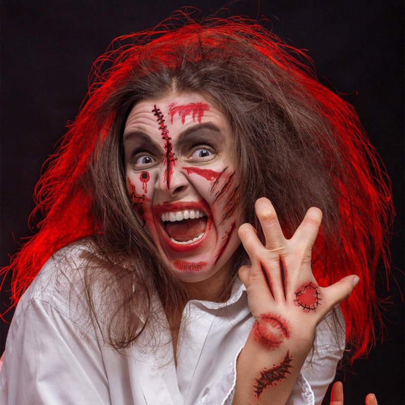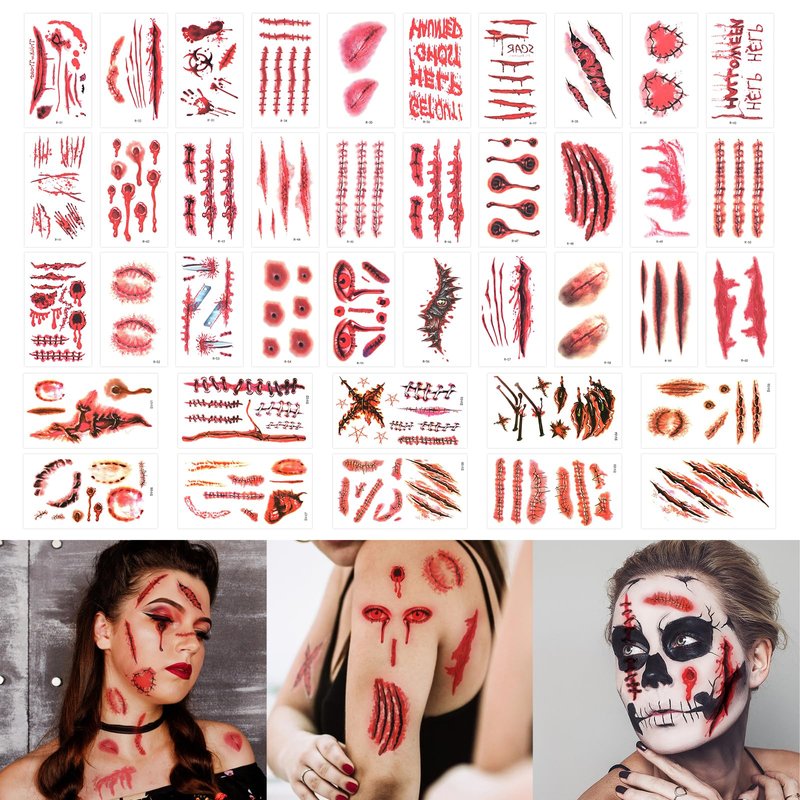 40 Sheets halloween temporary tattoos come with different patterns for you to choose and match.It comes with zombie tattoo,fake bloody wound,stitch scar scab,fake scars etc.You can combine them according to your interests or you halloween costume.