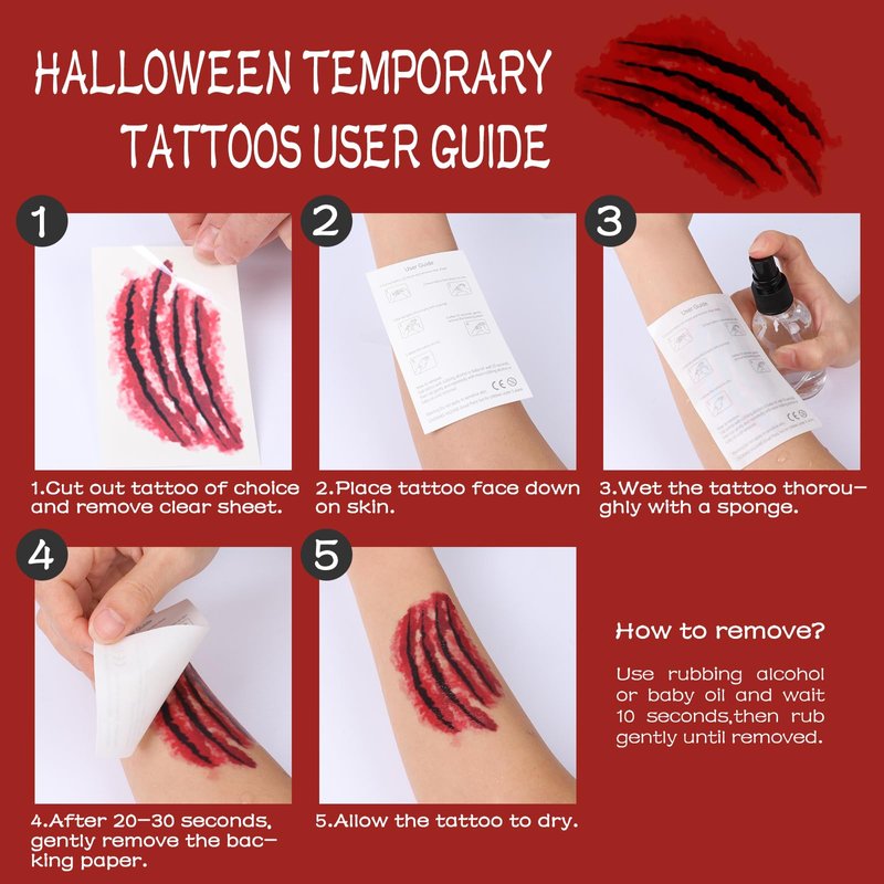 - Easy to Use: Just cut out halloween temporary tattoos of choice and remove clear sheet. Place tattoo face down on skin and wet the tattoo with water,then press for about 20-30 seconds and wait the tattoo to dry.The tattoo will last about 1-3 days and can also be easily rubbed off with alcohol or baby oil