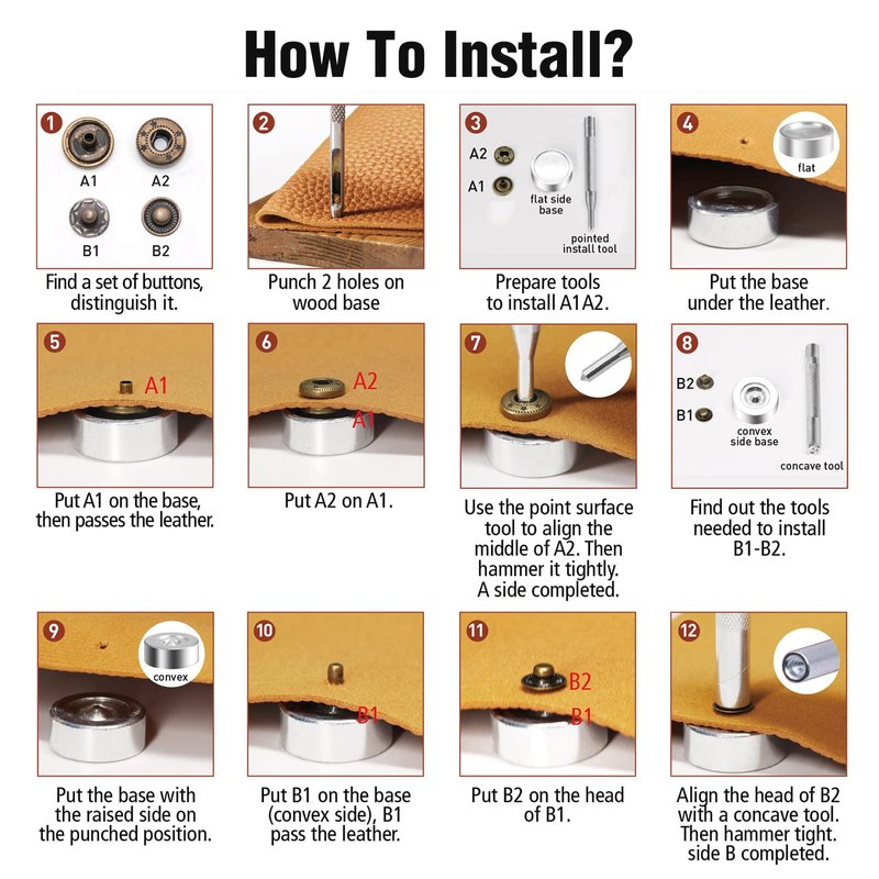 - DURABLE AND LONG-LASTING - All these snap fasteners are made of copper zinc alloy with nickle-free plating craft, they remains like new even after long time use. But please don't use too much force when strike the fasteners in case of deformation