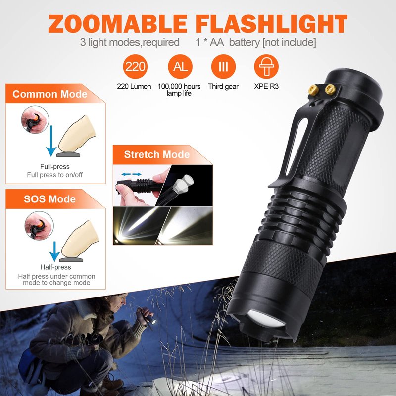 With zoomable design, heavy duty, compact handheld flashlights, zoom in for an intense beam or out for wider illumination. 3 light modes like High / Low / Strobe. With its ultra-bright LED light, and ability to run for hours of just a single AA Battery (Not Included).
