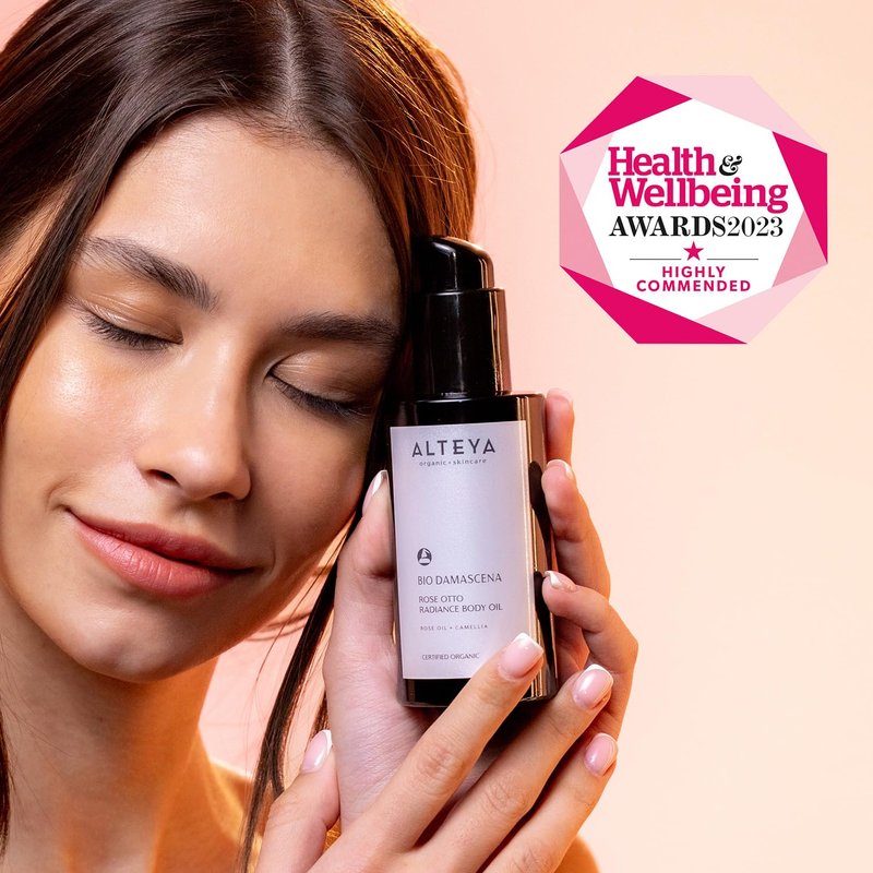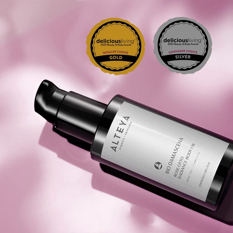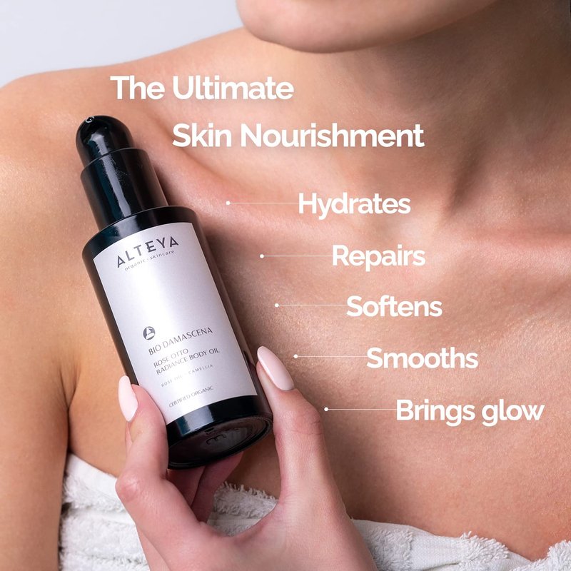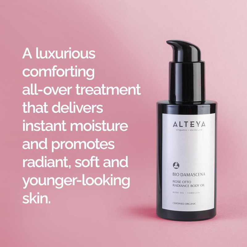 Alteya Organics Bio Damascena Rose Otto Radiance Body Oil - Certified Organic Body Moisturizer With Rose and Camellia Oil - Winner of Delicious Living Magazine Gold Award - 3.4Fl Oz/100mL