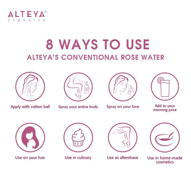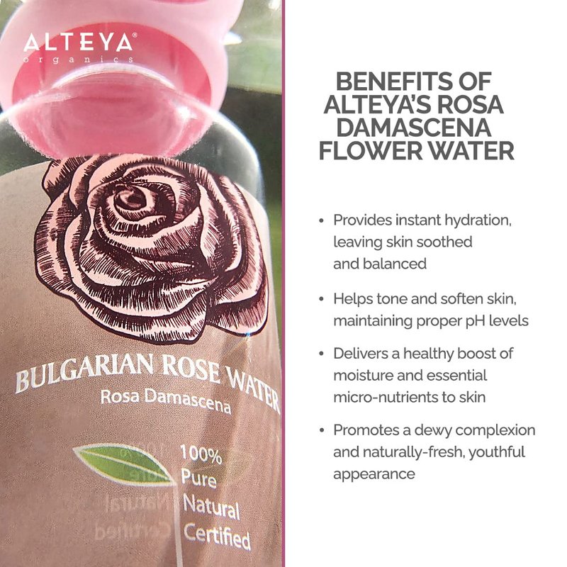 - PRIMARY STEAM-DISTILLED BY ALTEYA: Distilled directly from fresh Rosa Damascena Bulgaria petals, and via Alteya's proprietary methodology that combines traditions with science to capture the most complete range of aromatic plants’ benefits, with rich composition of essential oil micro-elements and full concentration of hydrophilic components. As a result, our rose water has multiple skin benefits and applications in beauty and wellbeing.