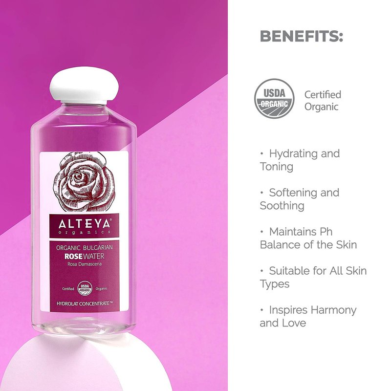 - PRIMARY STEAM-DISTILLED BY ALTEYA: Distilled directly from fresh Rosa Damascena Bulgaria petals, and via Alteya's proprietary methodology that combines traditions with science to capture the most complete range of aromatic plants’ benefits, with rich composition of essential oil micro-elements and full concentration of hydrophilic components. As a result, our organic rose water has multiple skin benefits and applications in beauty and wellbeing.