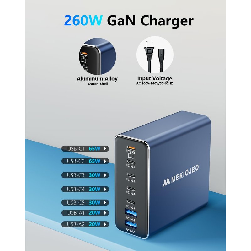 Aluminum Alloy USB C Charger 260W GaN Charger Fast USB C Charging Station 7 Ports 65W Laptop Charger for MacBook Pro/Air/iPad Pro/iPhone (Blue)