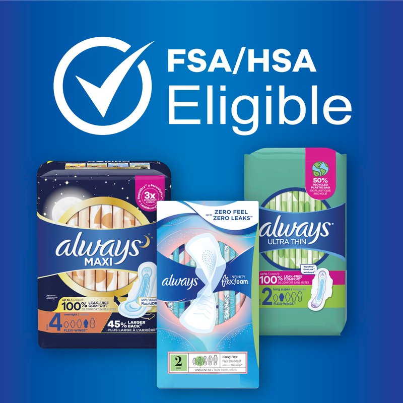 - FSA/HSA ELIGIBLE: Check with your FSA or HSA plan on the coverage of feminine products