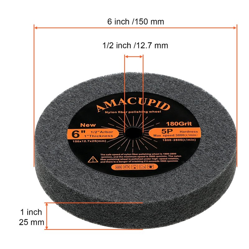 - Size: Nylon fiber polishing wheel diameter 6 inches/150mm, hole 1/2 (12.7mm), thickness 1 inch/25mm, density 5P, particle size 180 mesh. Please choose a suitable nylon fiber wheel according to the diameter and speed of your machine spindle