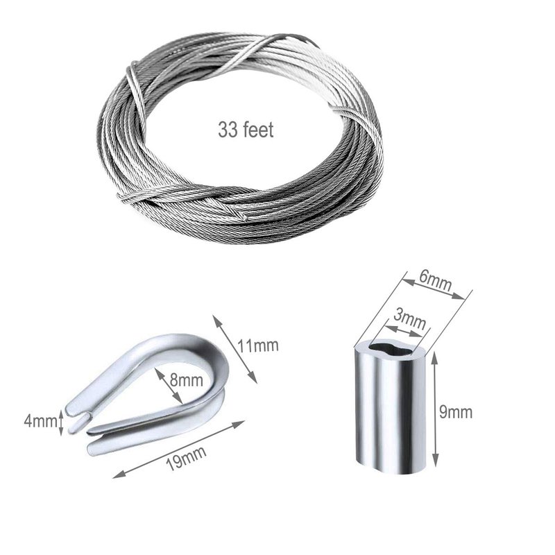 - 【COMPLETE SET】33 Feet Stainless steel cable wire rope, 20 pieces crimping loop sleeve, 6 pieces thimble.