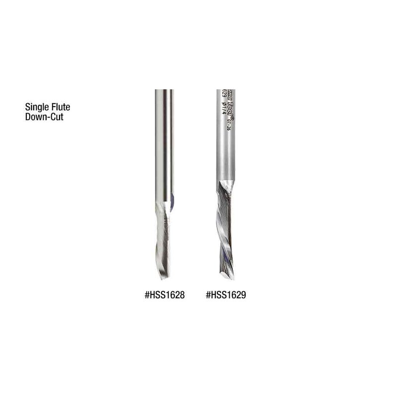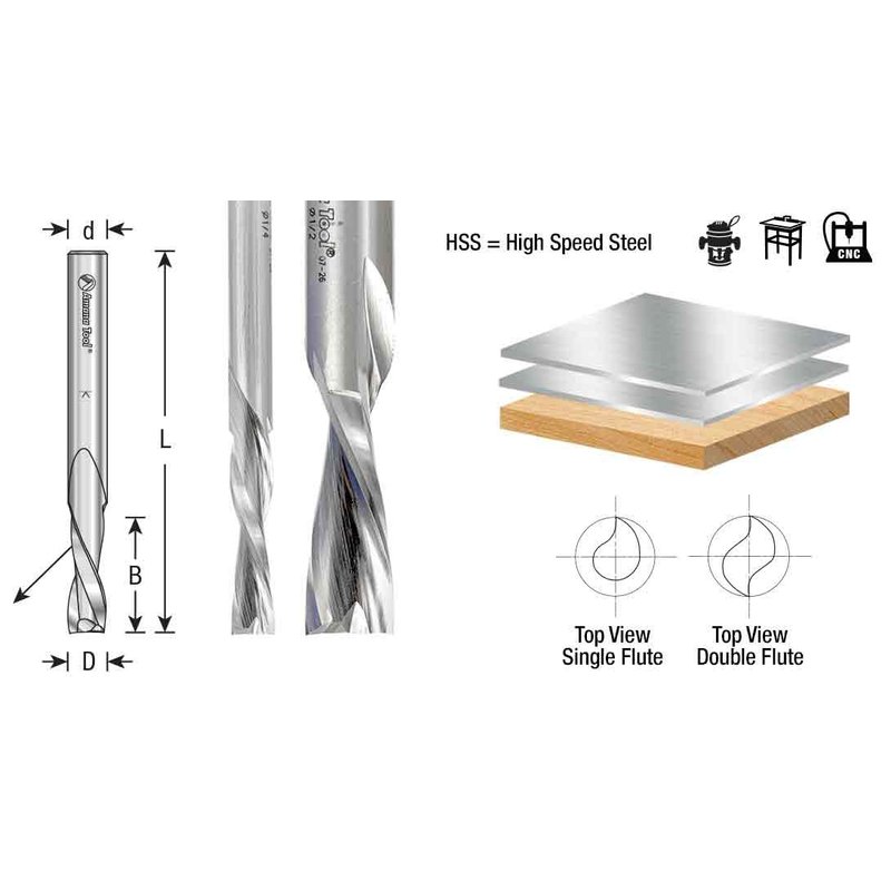 The down cut router bits are recommended when chip removal is directed down to protect the finish of the top of the material that is being cut. The double flute bits provide a smooth finish when grooving and slotting. Use the single flute router bits for routing materials where speed and easy chip removal are desired. Use the aluminum bits for cutting Fomex with Aluminum Face, Sheet and Aluminum Extrusions, Aluminum 5052, and Wood.