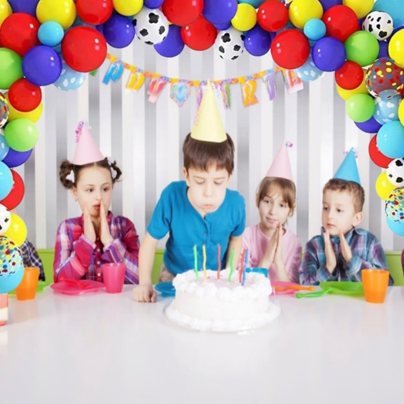 - Package Includes: 12" blue red yellow confetti balloons, 12'' cloud/cow pattern/dark blue/red/white dots fruit green/yellow latex balloons, 10" latex balloons, 5'' dark balloons, tying tool, silver ribbon, 100 glue points and balloon arch strip