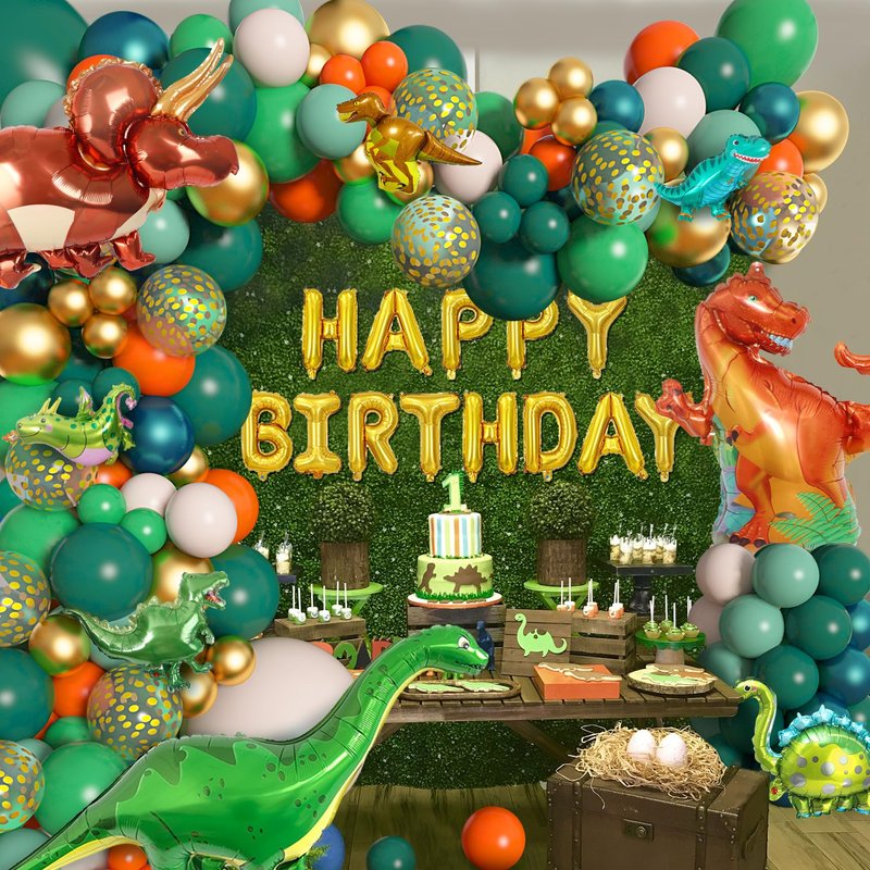 - Dinosaur Balloon Garland Kit - 167pcs: small dinosaur print balloon(6pcs), big tyrannosaurus balloon(2pcs), 18''dark green/nude balloon(2pcs), 12''dark green/green/gold confetti balloon(30Pcs), 10''orange/sage green/nude/peacock blue/metallic gold balloon(50Pcs), 5''dark green/green/orange/metallic gold balloon(60Pcs), 16'' gold happy birthday foil balloon(13 letters), 4pcs balloon tool(balloon arch strips,tying tool,100 glue points, ribbon), meet all your dinosaur birthday decorations needs.