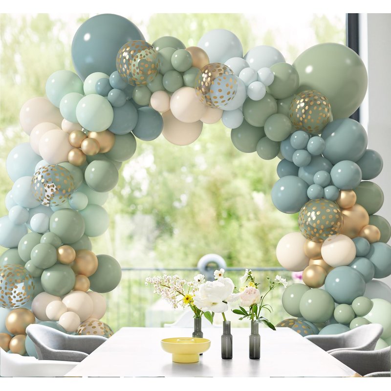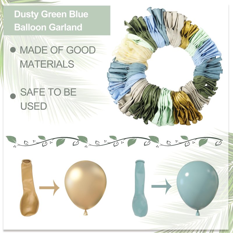 - Blue and Green Balloon Arch Kit Includes: 18" dusty blue/sage green balloons(2 pcs), 12" dusty blue/sage green/pastel blue/pastel green /sand white/confetti balloons(38 pcs), 10" dusty blue/sage green/pastel blue/pastel green /sand white/metallic gold balloons(52 pcs), 5" dusty blue/sage green/pastel blue/pastel green /sand white/metallic gold balloons(74 pcs) and 4 pcs balloon tools(balloon arch strip, glue points, tying tool, robbon)