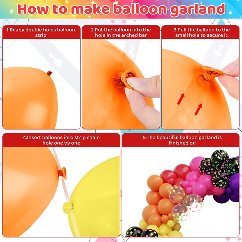 - Easy to Use: Our glow in the dark party supplies comes with balloon accessories which can help you create the great rainbow balloon arch kit; You can inflate the balloons with air or helium, hanging them together using the balloon strips, stick the balloons to the balloon arch with glue points; Our neon garland is already strung, saving you time and effort; You can enjoy the DIY process with friends and family