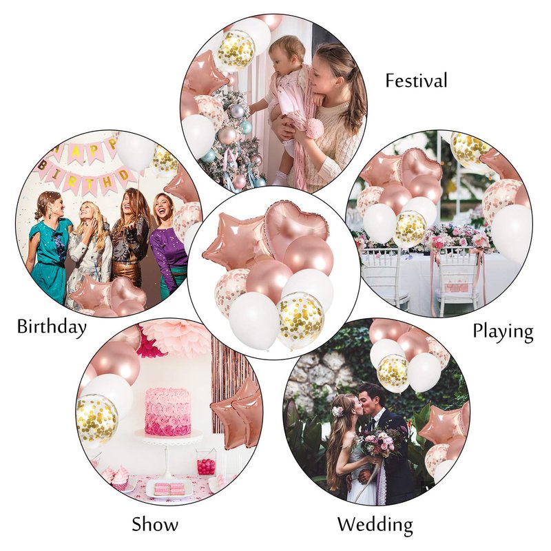 - Package Includes: 18'' star foil balloons(2 Pcs), 18'' heart foil balloons(2 Pcs),12"rose gold confetti balloons(6 Pcs), 12" gold confetti balloons(4 Pcs), 12" rose gold balloons(12 Pcs), 10'' white pearlescent balloons(12 Pcs), 10 pcs brown/light pink paper tassels, 1 pcs rose gold "happy birthday" banner, 1 pcs rose gold metallic tinsel fringe curtains, 2 pcs silver ribbons, meet all your rose gold party decorations ideas