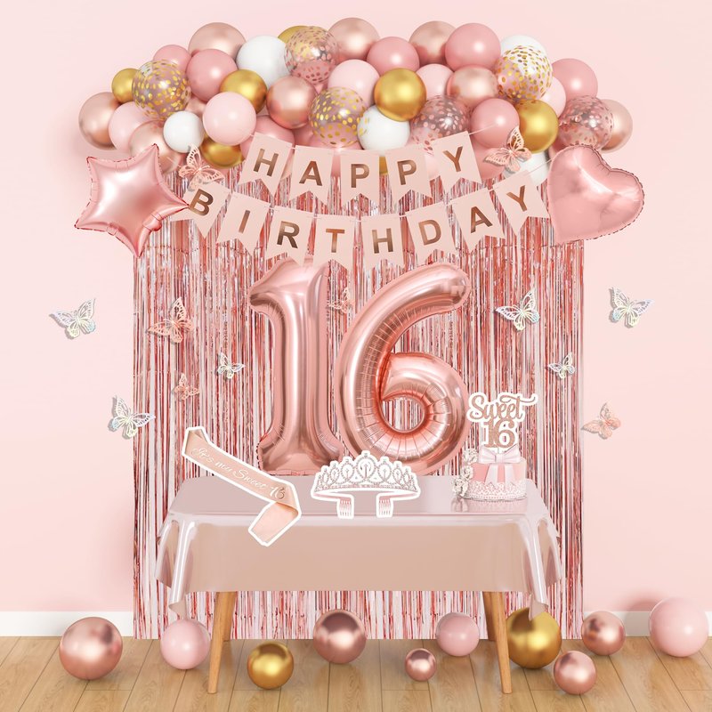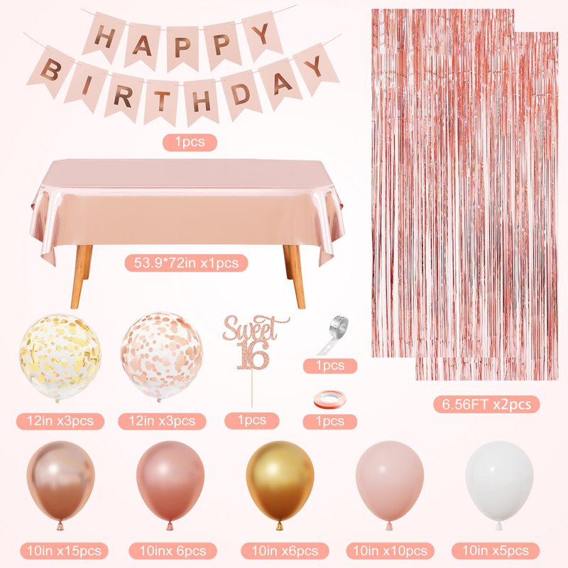 - Sweet 16 Party Decorations: Valuable rose gold birthday decorations kit for a sweet 16- great value, design and color; Decorate your children's bedroom doors the night before the day so that she wakes up with something special to start her 16th birthday; This sweet 16 decorations set for your daughter's sweet sixteen will exceed your expectations; Your 16 years old daughter will love it, and it will be the background for opening presents at her party