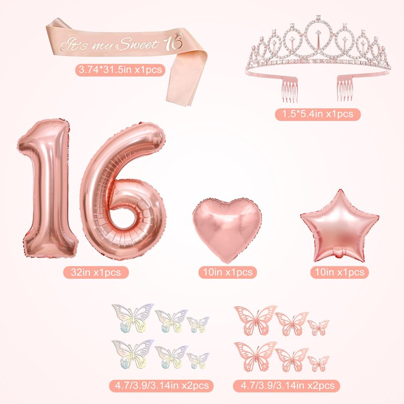 - 16th Birthday Decorations for Girls: This rose gold party decorations contain all for a sweet 16 party; 1 pcs table cloth, 1 pcs birthday crown, 1 pcs birthday sash, 2 pcs foil fringe curtains, 1 pcs birthday crown, 1 pcs birthday sash, 2 pcs foil fringe curtains, 1 pcs happy birthday banner, 1 pcs sweet 16 cake topper, 12 pcs butterfly wall decor, rose gold foil balloons(32"number 16/10"star/10"heart/), 12"rose gold/gold confetti balloons(6 pcs), 10"white/pink/pearl rose gold/metallic gold/metallic rose gold balloons(42 pcs) and 2 pcs balloon tools