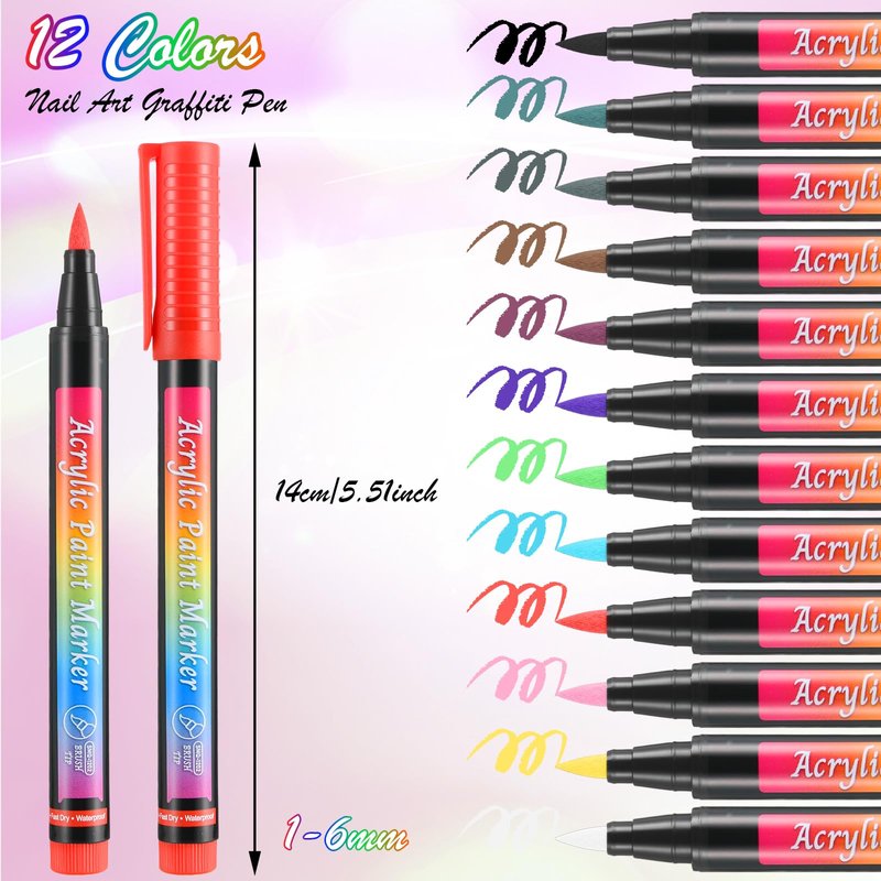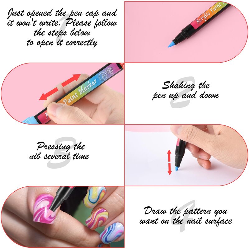 - Easy to Use: Simply shake the pens up and down to ensure the ink is evenly mixed, then press the pen tip until the ink flows out. After that, you can start your nail art design and let your imagination run wild. These nail art pens work on a variety of surfaces such as metal, paper, stone, rubber, ceramics, wood, canvas, glass, plastic, etc, making them perfect for a wide range of artistic projects.