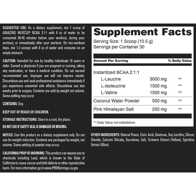 - 3000 mg L-Leucine, 1500 mg L-Isoleucine, 1500 mg L-Valine Per Serving BCAA Supplement - 30 Servings per Bottle, 1 Scoop (10.5 G) Per Serving Powder - Non-GMO, Gluten Free, Third Party Tested - Manufactured in accordance with GMP Standards - Proudly made in the USA with Guaranteed Purity & Potency
