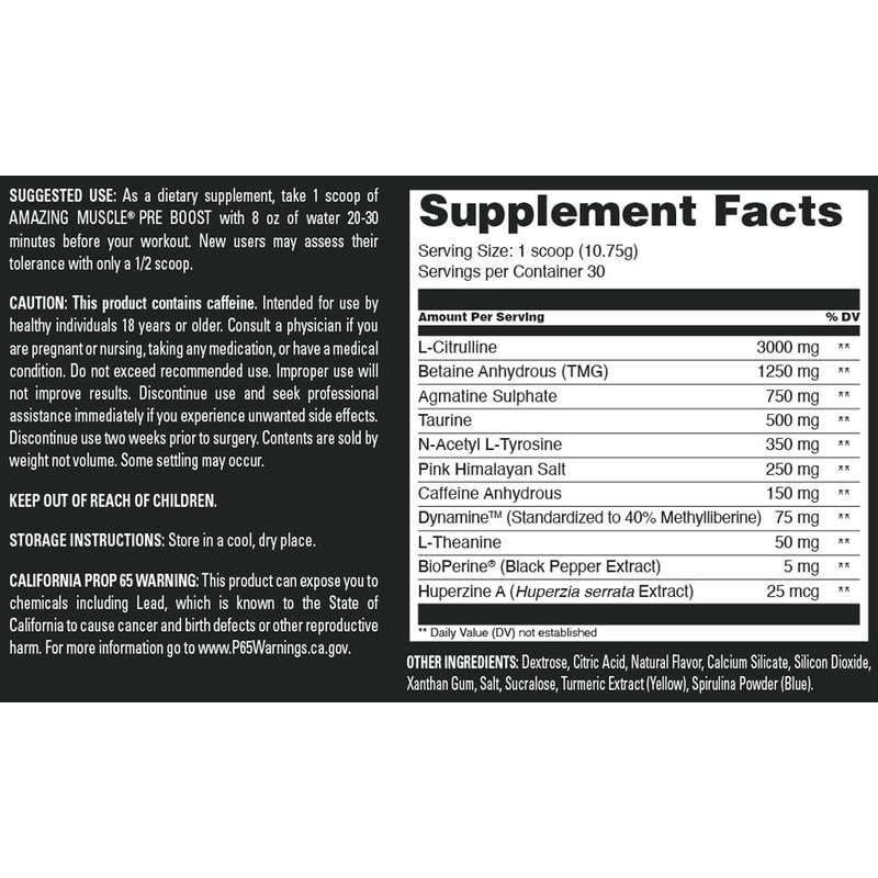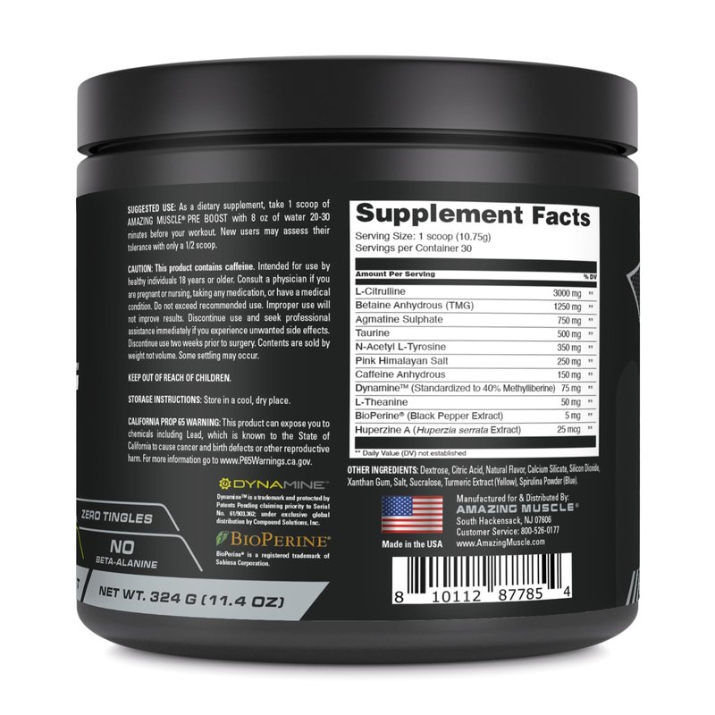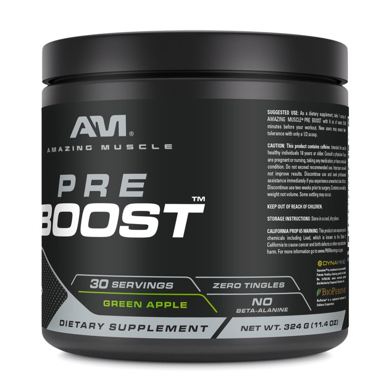 Amazing Muscle Pre Boost | 30 Servings | 324 Grams Powder | Pre Workout Supplement | Made in USA (30 Servings, Natural Green Apple)