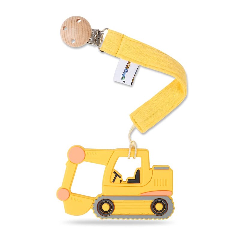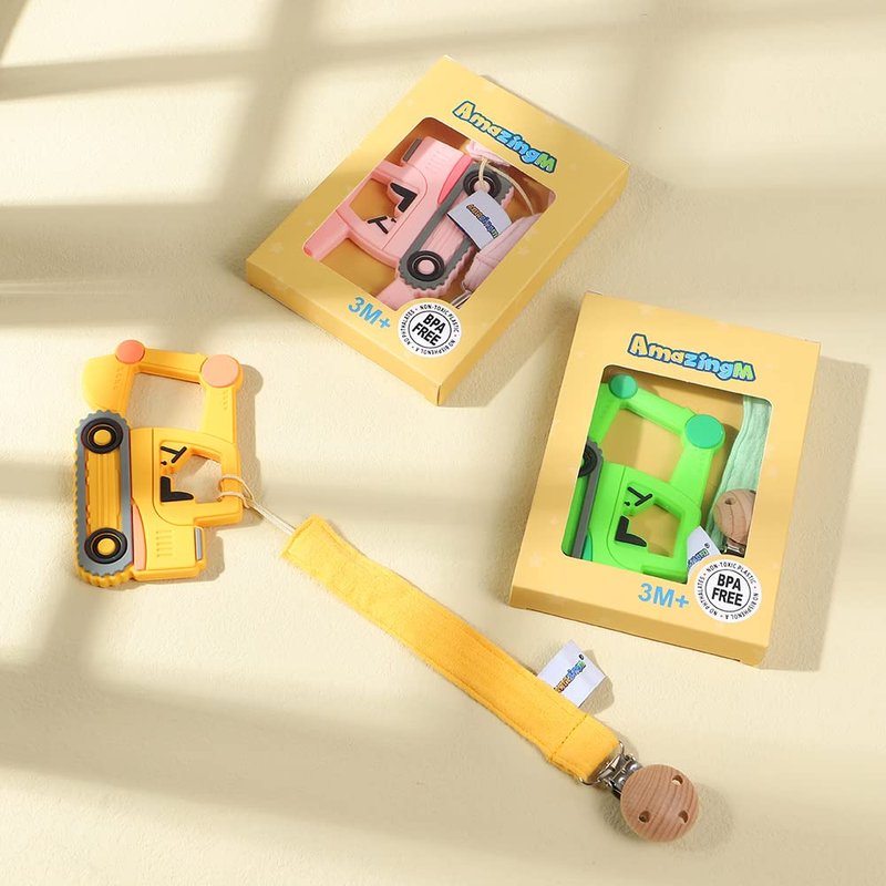 AmazingM Baby Food Grade Silicone Car Teether Toy with Pacifier clip Holder,Teething Pain Relief Toys Gift Set for 3 Months+ Boys and Girls,Freezer Safe,BPA Free (Excavator, Yellow)