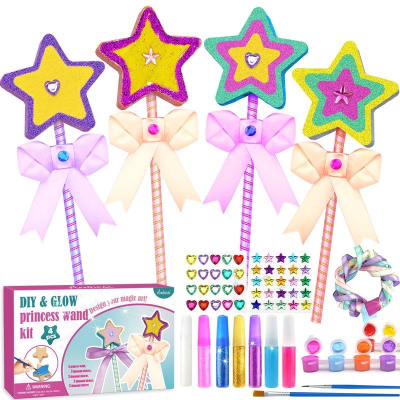 - Make Your Own Princess Wand Kit: One-of-a-kind DIY Wand making kit designs are awesome! The wooden craft kit comes with 4 pieces of unfinished princess wands, 2 sets coloured paints, 2 brushes and 4 coloured glitter glue pens, 8 pieces of coloured ribbons, and 3 gem stickers.