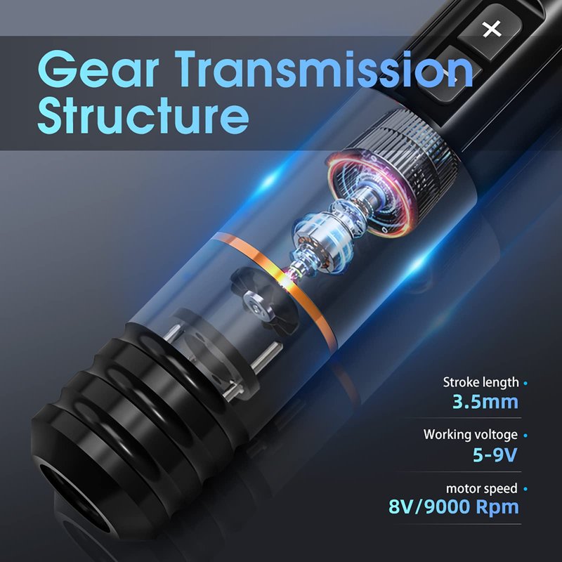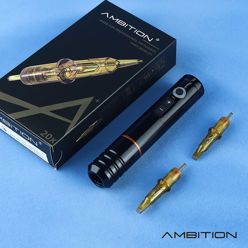 - Ambition cartridges tattoo needle are made of 316 medical stainless steel. Each needle is screened and tested strictly, come with safety membrane to prevent ink leakage to the tube or machine. Ambition tattoo pen built-in custom coreless motor, 10V - 9000RPM.The stroke length of our pen machine is 3.5mm. Perfect for packing colour and shading, performs well for both lining and shading. This tattoo pen machine advanced gear system that make sure reliable, quiet operation and less vibration.