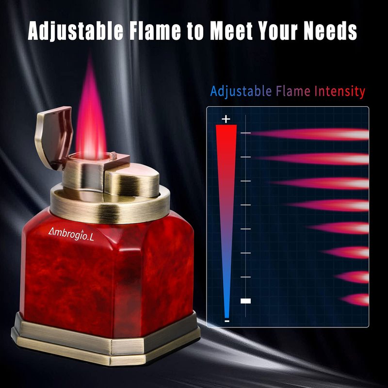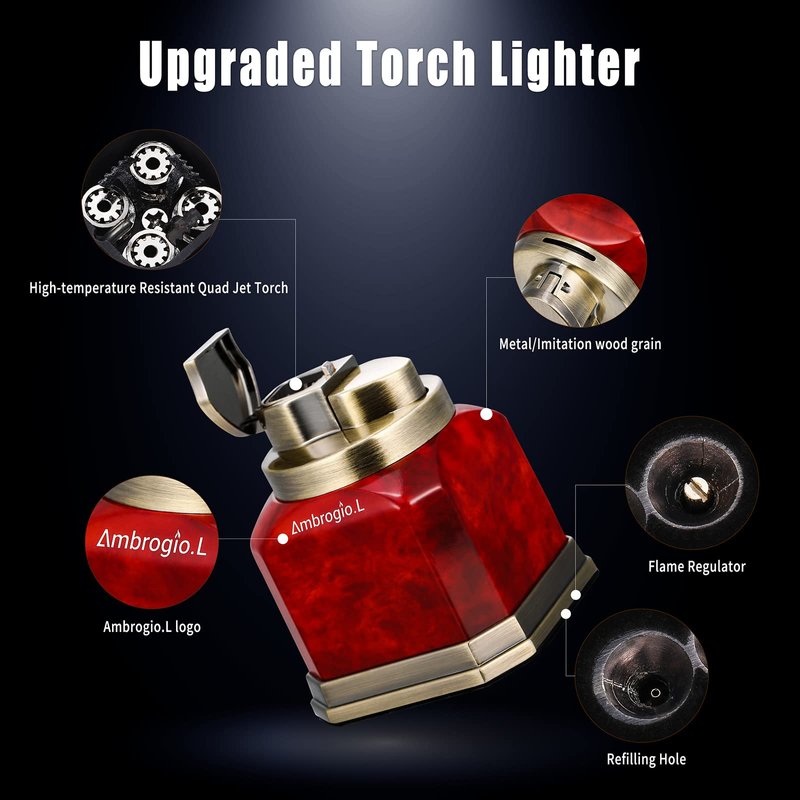 - Powerful quad red flame jet torch lighter,it features adjustable flame contorllor on the bottom and refillable butane gas for long-time use