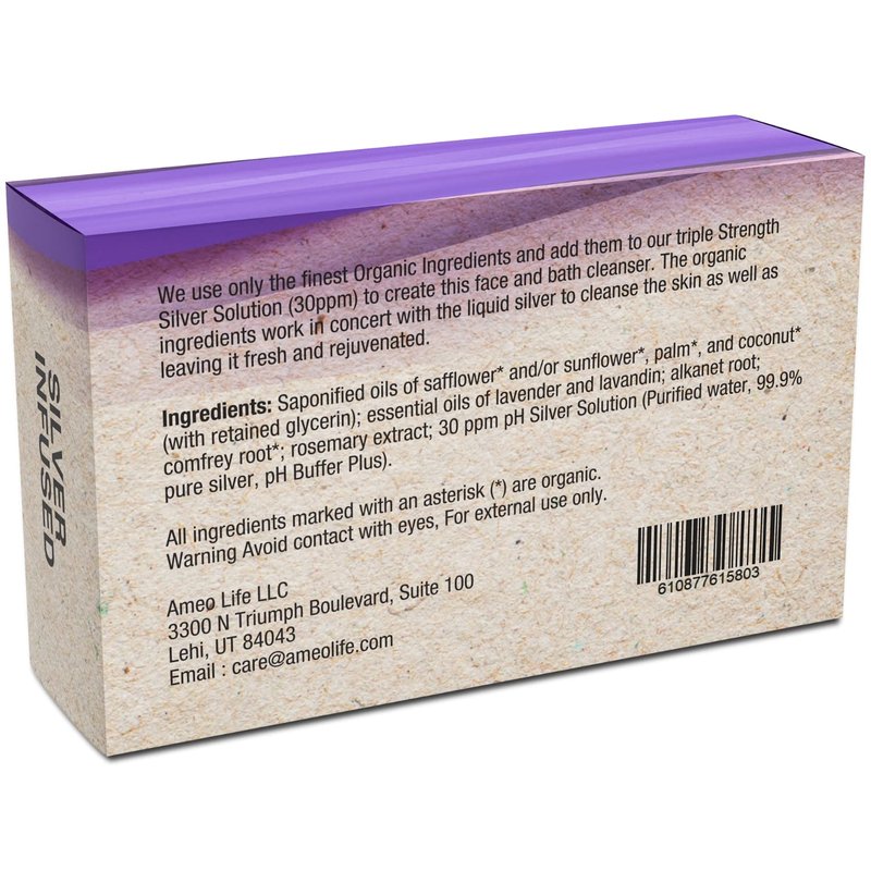 Ameo Life Organic Lavender Silver Soap with 30 ppm Silver - Naturally Cleanses the Skin, 4 oz Colloidal Silver Soap Bar for Women and Men