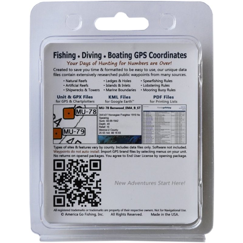 - Includes waypoints for shipwrecks, artificial and natural reefs, ledges and holes, islands and inlets, marine boundaries, spearfishing and lobstering rules (varies by county).