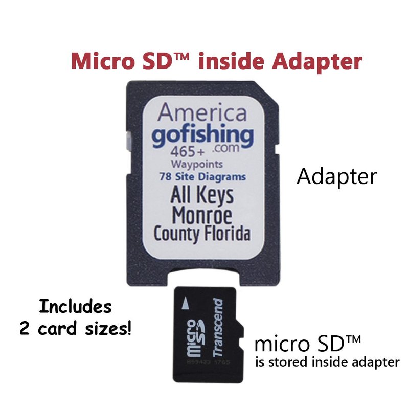 Compatible with Garmin Humminbird Lowrance Raymarine Simrad. Unique, easy to use data files for fishing, diving & boating on a microSD memory card stored inside Adapter - includes 2 card sizes!