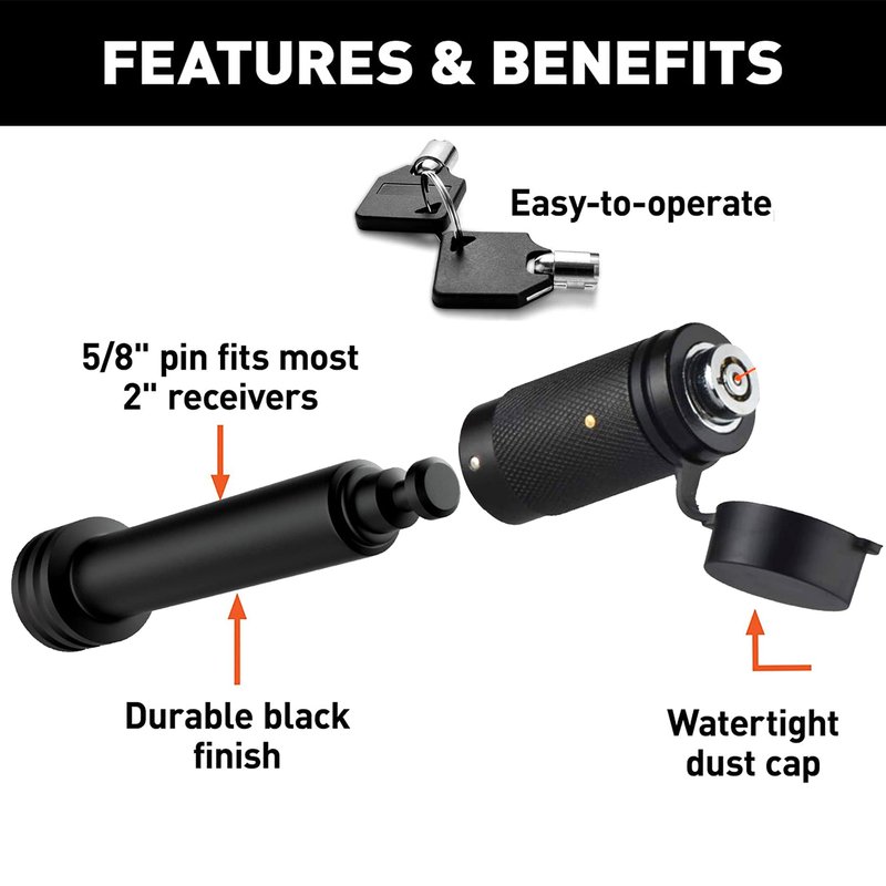 - trailer hitch lock is made of solid hardened steel, and is not easily broken or rusted. With a 5/8-inch diameter pin, our product fits most Class III & IV hitches with 2 inch receivers.Each lock cylinder is unique and protects your hitch from theft.2 keys are included