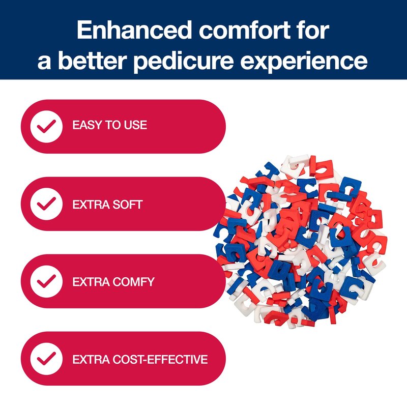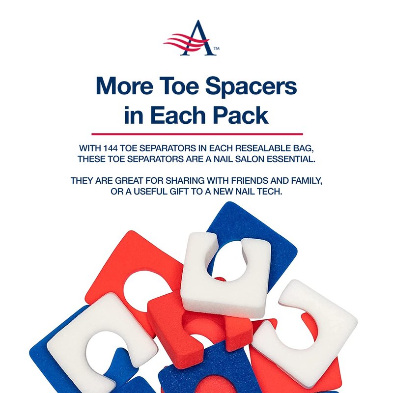 Includes: 144 single toe separators in a resealable bag (48 Red, 48 White, 48 Blue)