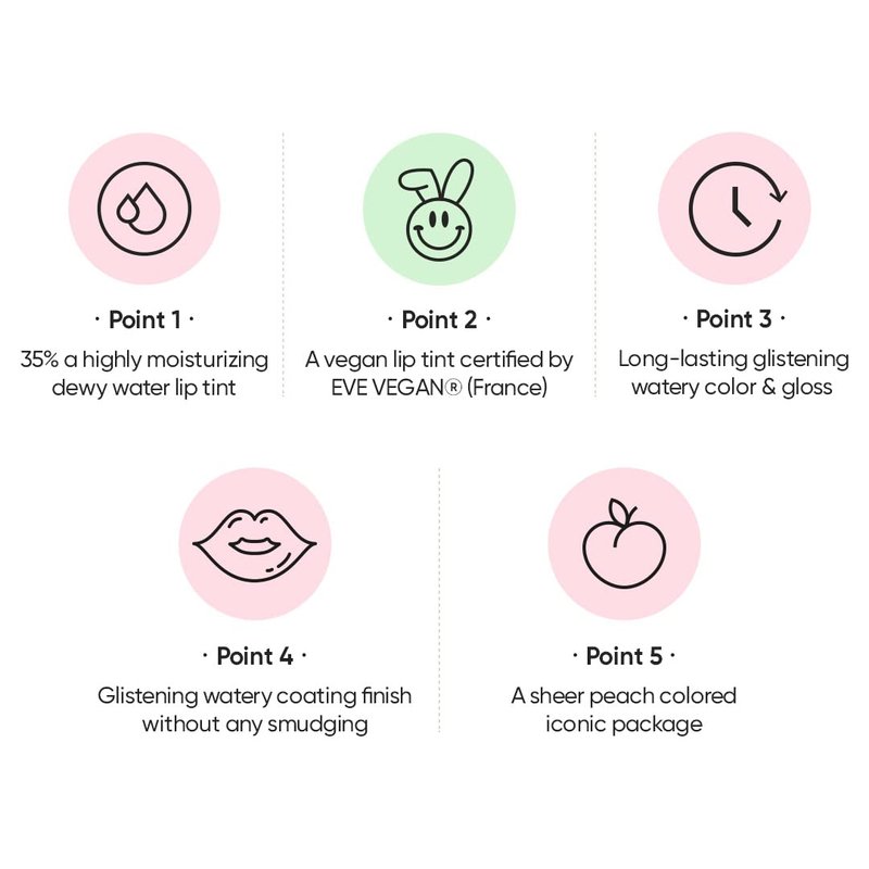 Dewy and long-lasting 35% water-infused vegan lip tint, in a light and fresh watery texture. Color pigment adheres to lips perfectly, and dewy glow rises up, leaving a water-coating finish on your lips.