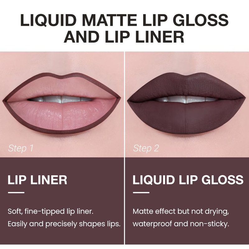 AMY'S DIARY 2pcs Chocolate Lip Liner & Lipstick&Shiny Clear Lip Oil Makeup Set, Liquid Lipstick 24H and Lip Liner Set Matt Liquid Lips Make Up Waterproof Long Lasting (02#, 2 Pcs Set)