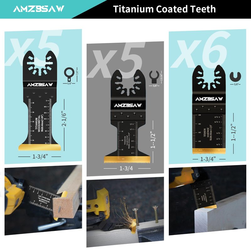 - 【3 Types 16PCS Titanium Oscillating Saw Blades】Compared with ordinary saw blades, the hardness of titanium saw blades is increased by 50%, and the service life is extended by 2X. Includes 3 different types of oscillating multitool blades, 6pcs 1-3/8"inches, 5pcs 1-3/4"inches, and 5pcs extra long 1-3/4"inches.