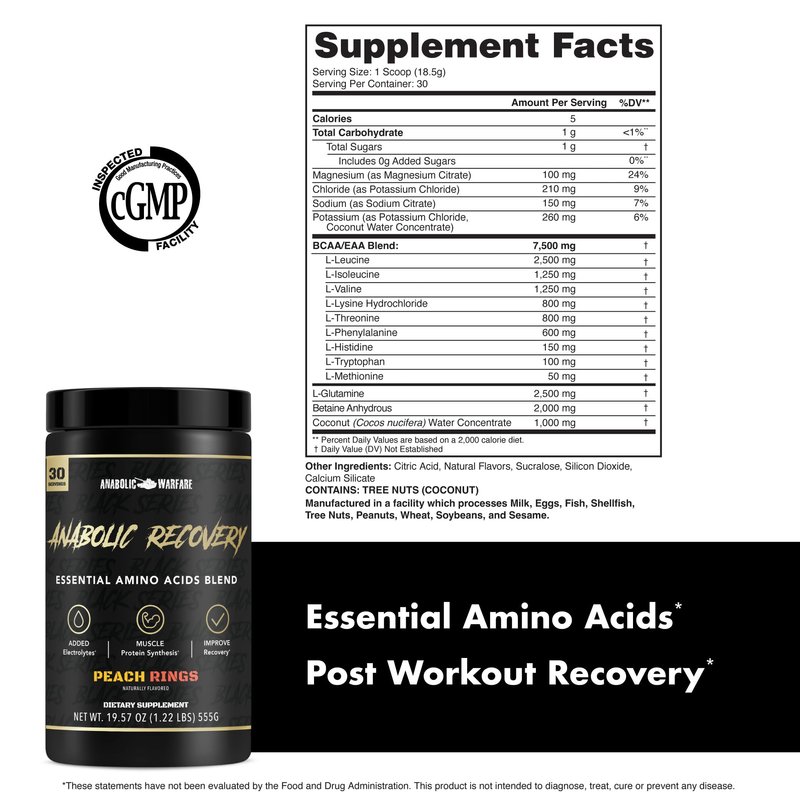 - Post Workout Recovery* - Recovery is just as important as your training, but it is often overlooked. Giving your body the optimal time and nutrients it needs will have you crushing plateaus in no time. Anabolic Recovery contains 7500mg of 9 Essential Amino Acids per serving. Not only do these key ingredients support muscle recovery, but it also promotes protein synthesis.*